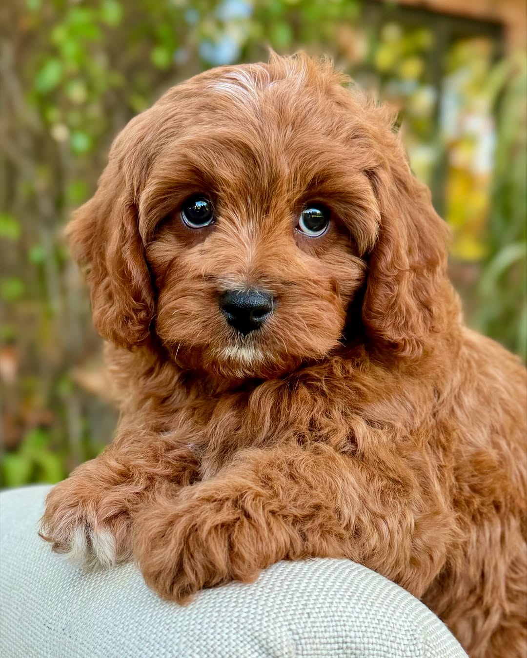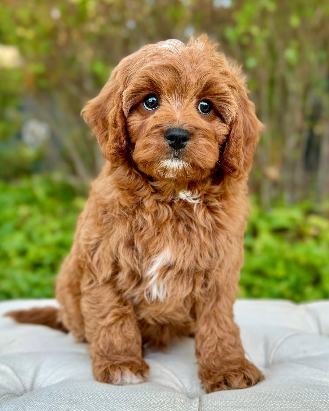 Lolita is a 9-week-old F1B with a soft, red and white wavy coat and a calm, affectionate personality. She’s a happy little girl who enjoys exploring her surroundings but is always content to settle in for cuddles. Born on July 20th and currently weighing 4.1 lbs, Honey is expected to be 15–20 lbs full grown. Both parents are genetically health tested to ensure strong, healthy puppies.